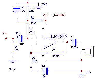 LM1875是一高质量的音响放大器,它可以为4欧姆的负载提供25W的输出功率。当使用单电源供电时,它能向4欧姆的负载提供20W的功率。并且只产生0.015%的失真。