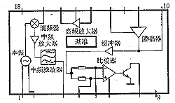 从外接天线接收的信号经C8耦合到L3、C9组成的选频网络进行阻抗变换后输入RX3310的内部高频放大器输入端14脚,经芯片内的高频放大后(增益为15~20DB)的信号再经混频器与本机振荡信号(316.8M)混频,产生1.8M的中频信号,此中频信号经内部中频放大后由第3脚输出,再进入比较器放大整形,最后数据从第8脚输出。