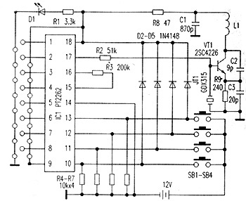 这是一种目前用途非常广泛的100米四键遥控模块,常用于报警器设防解防、车库门遥控、摩托车、汽车的防盗报警等,这类产品的用途要求遥控器的遥控距离并不远,一般20米足够了,但要求:遥控模块价格低廉,发射机手柄体积小巧、外观精致,耗电尽可能省,工作稳定可靠。