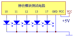 我们为了测试遥控模块工作是否正常,可以在接收模块的VCC和GND端加一个5~6伏的直流电压,也可以通78L05三端稳压芯片稳压获得5伏稳压工作电源,在10、11、12、13、17端分别对地接一个发光二极管(发光二极管负极接地)这里提供的遥控模块的接收机都是锁存型的,也就是说能够保持遥控信号的瞬间状态,假设我们按动发射机的A按键时,与其对应11路的LED即可发光,松开发射机的A按键,11路的LED仍然点亮处于自保持状态(锁存),直到按动其它的按键如B键时,11熄灭而12处的LED点亮。17端是解码有效输出端,不论按动发射机的哪一个按键,只要解码成功即17端变成高电平,直到发射机停止发射。