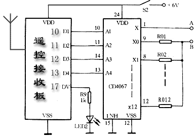 当分别按动遥控器上的1~12个按键时,D1~D4依次输出0001升至1101,该数据送入CD4067的地址输入端A1~A4,对应于模拟开关从x0至x11依次和1脚接通,而x0至x11分别接有阻值逐渐减小的电阻,这样A、B之间的阻值会慢慢减小,音量相应慢慢增大;与上相反,音量将慢慢增大。接收模块板的第17脚接有一个发光二极管LED2,可以同步指示接收成功信号。