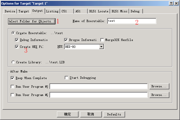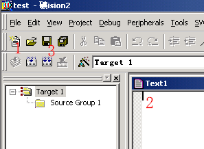 (3)首先我们要在项目中创建新的程序文件或加入旧程序文件。如果你没有现成的程序,那么就要新建一个程序文件。在KEIL中有一些程序的Demo,在这里我们还是以一个C程序为例介绍如何新建一个C程序和如何加到您的第一个项目中吧。点击图1-5中1的新建文件的快捷按钮,在2中出现一个新的文字编辑窗口,这个操作也可以通过菜单File-New或快捷键Ctrl+N来实现。好了,现在可以编写程序了,光标已出现在文本编辑窗口中,等待我们的输入了。第一程序嘛,写个简单明了的吧。下面是经典的一段程序,呵,如果你看过别的程序书也许也有类似的程序: