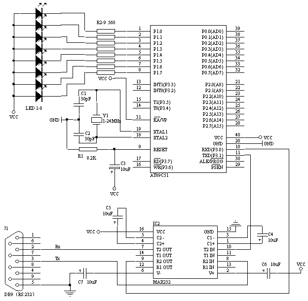 :( 还有这么多运算符呀!暂时停一停吧,我们先来做一个实验吧。学习运算符和另外一些知识时,我们还是给我们的实验板加个串行接口吧。借助电脑转件直观的看单片机的输出结果,以后我还会用一些简单的实例讲解单片机和PC串口通讯的简单应用和编程。如果你用的是成品实验板或仿真器,那你就可以跳过这一段了。