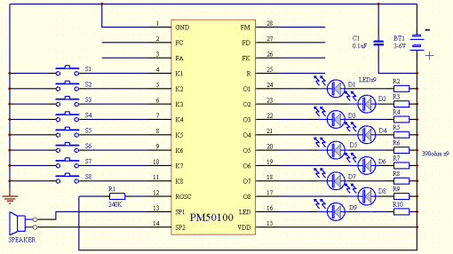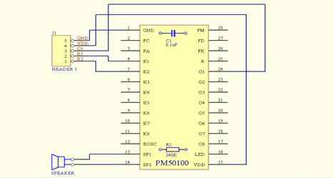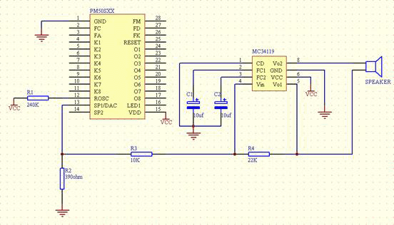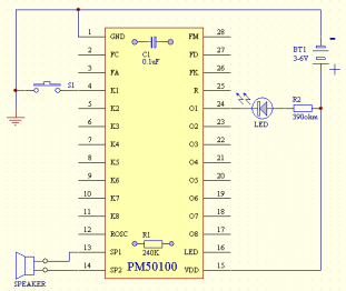 五、PM50的最小系统(仅一片PM50芯片就可以作为一个小的语音系统,下图是单段单灯,或单键顺序多段放音。振荡电阻及滤波电容板载,用户只需要外接喇叭、电源、按键就可以工作了。)