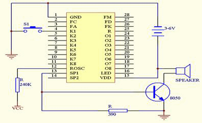 在该串行模式下,K5、K7端连接按键就赋予了特殊的演示、测试功能,K5端每按键一次即顺序播放一段,可以逐段听取所有段的语音内容和效果;K7端每按键一次,即按顺序连续播放八段的语音,以便听取语音组合时的合成效果。另外,K2端如果接按键,可以作为测试时的复位端使用。