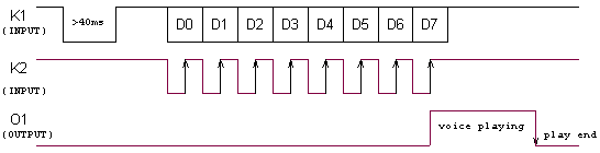 在该串行模式下最大可分128段,K1为数据端,K2为时钟端,O1为忙信号端。时钟上升沿时数据端有效。语音段的地址为80H~FFH,第一段的地址是80H,按顺序排列,最多128段语音。外部单片机直接送入要放音的段号数据,播放,结束时PM50的忙信号拉低,在判断一段语音结束时,外部单片机再送下一段语音的段号。