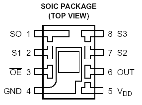 S0、S1用于选择输出比例因子或电源关断模式;S2、S3用于选择滤波器的类型;OE反是频率输出使能引脚,可以控制输出的状态,当有多个芯片引脚共用微处理器的输出引脚时,也可以作为片选信号,OUT是频率输出引脚,GND是芯片的接地引脚,VCC为芯片提供工作电压,表1是S0、S1及S2、S3的可用组合。