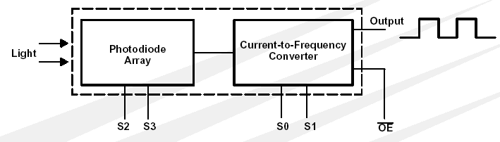 从图1可知:当入射光投射到TCS230上时,通过光电二极管控制引脚S2、S3的不同组合,可以选择不同的滤波器;经过电流到频率转换器后输出不同频率的方波(占空比是50%),不同的颜色和光强对应不同频率的方波;还可以通过输出定标控制引脚S0、S1,选择不同的输出比例因子,对输出频率范围进行调整,以适应不同的需求。